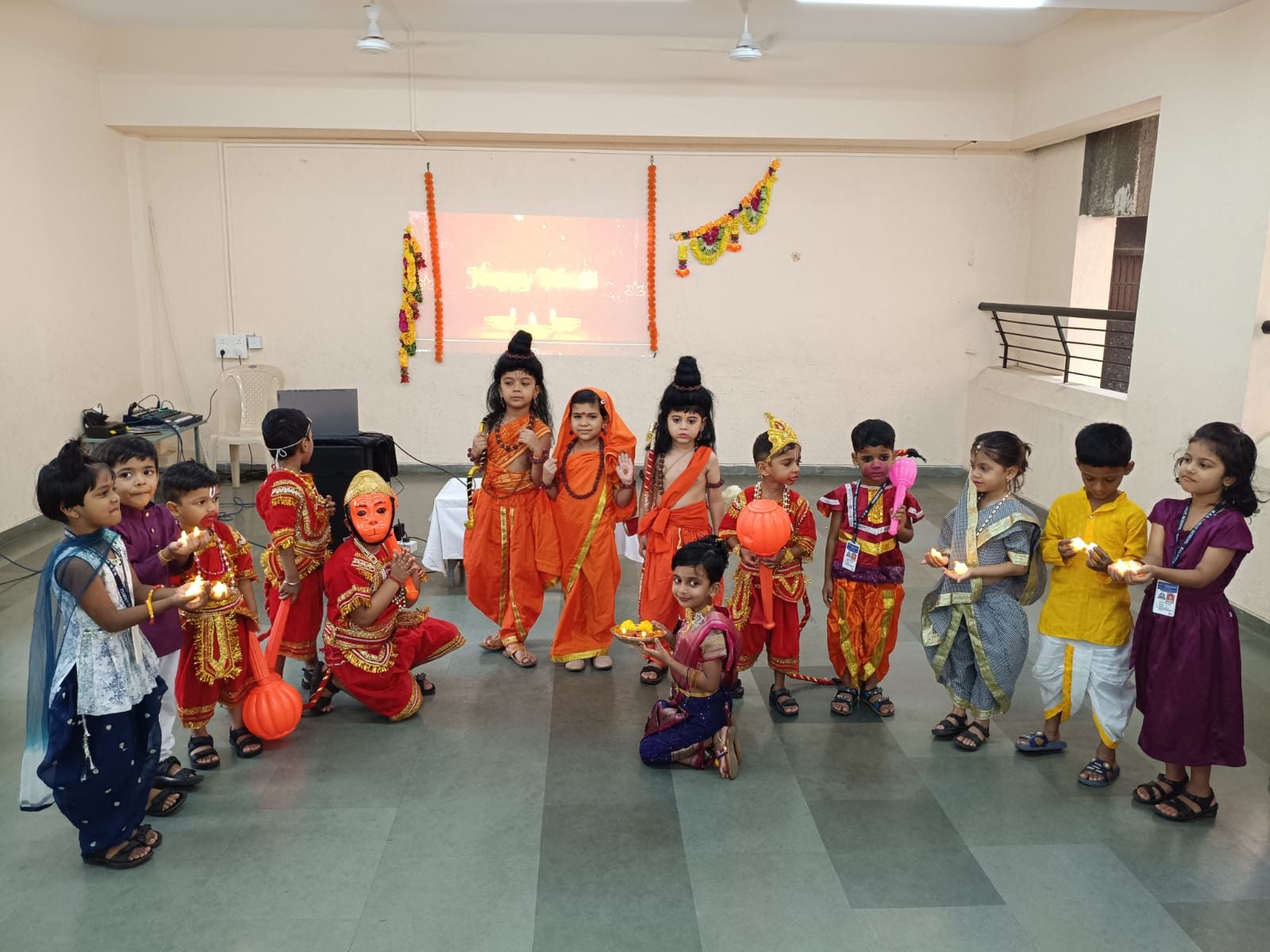 A special assembly was conducted by the Pre-Primary section on the occasion of Diwali to showcase the significance of the festival. The celebration began with a short skit depicting the story of Lord Ram, his victory over the demon king Ravana, and his return to Ayodhya with Mata Sita and brother Lakshman after 14 years of exile. Through the skit, children beautifully conveyed the message of the triumph of good over evil.