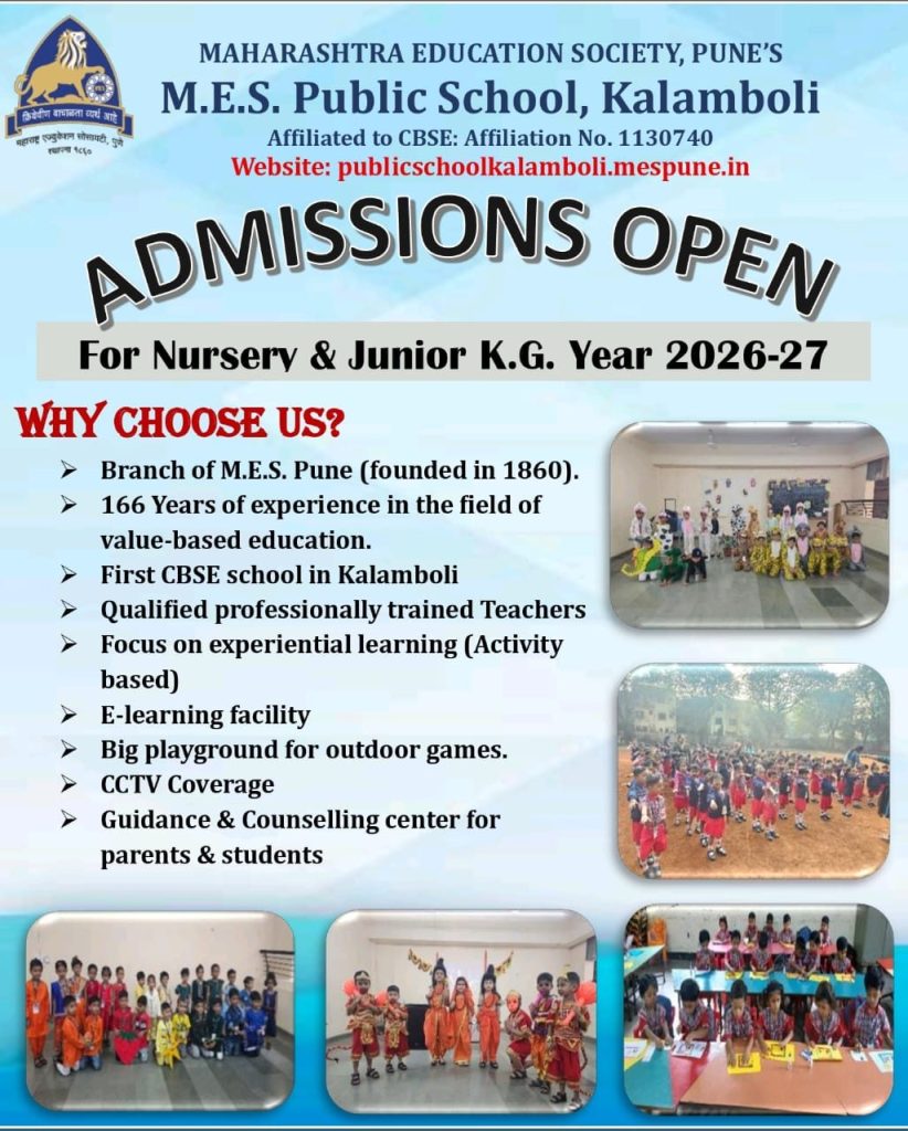 MES PUBLIC SCHOOL, is the first CBSE school in Kalamboli, Navi Mumbai. It was started in 2014 by Maharashtra Education Society Pune, which has widespread interest in the sphere of quality education with commitment of excellence. MES is one of the oldest private institutions in India.